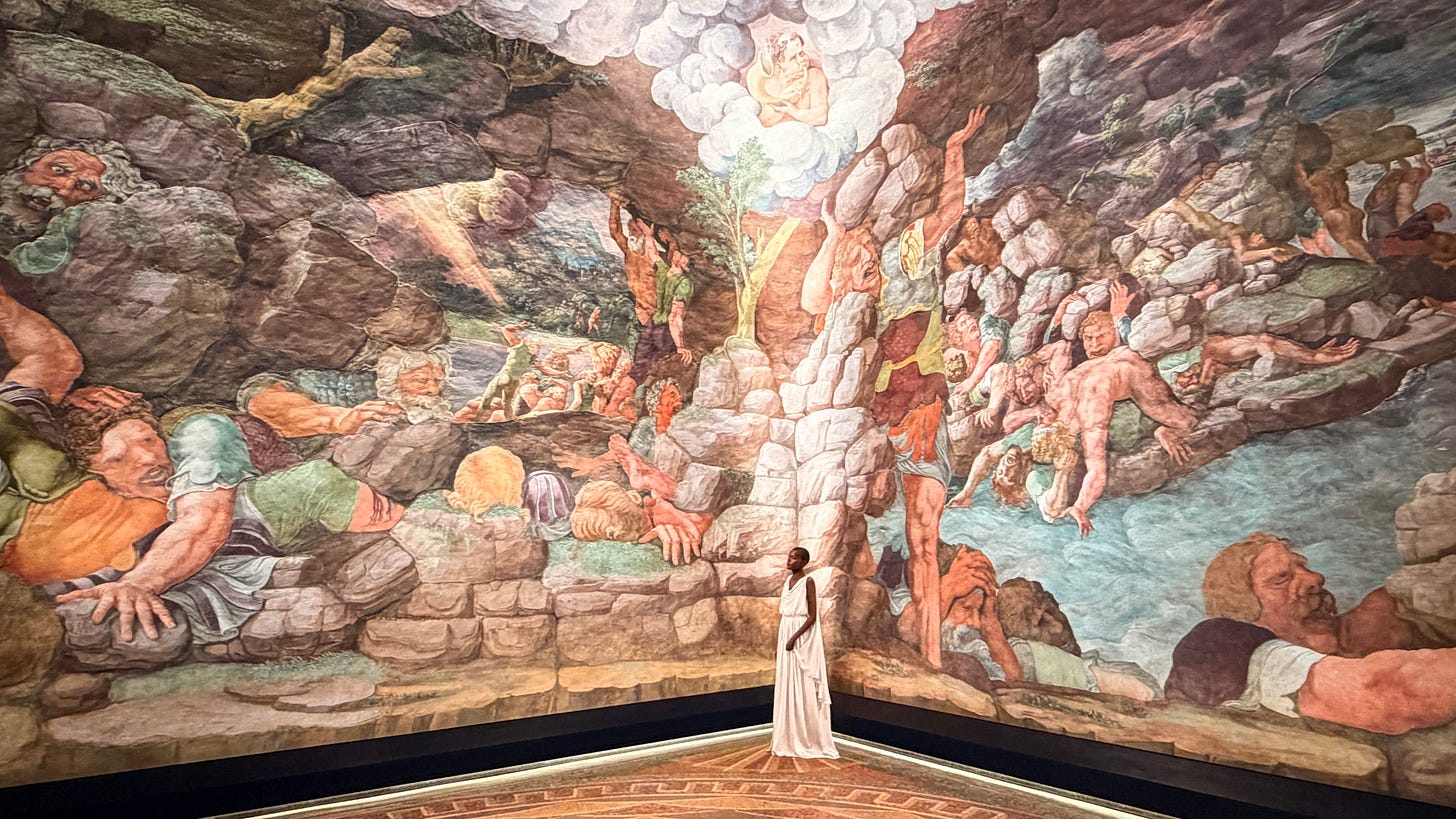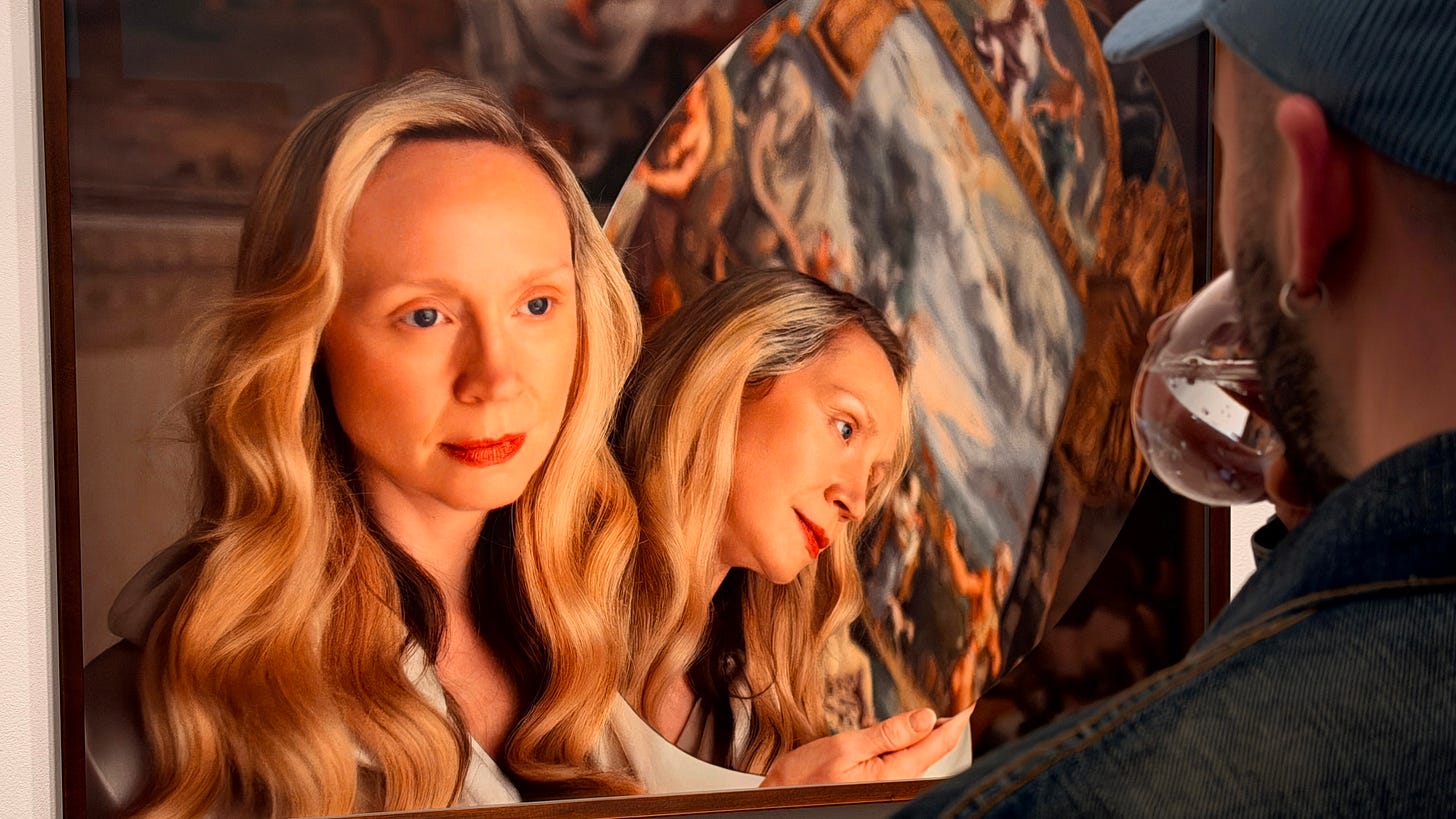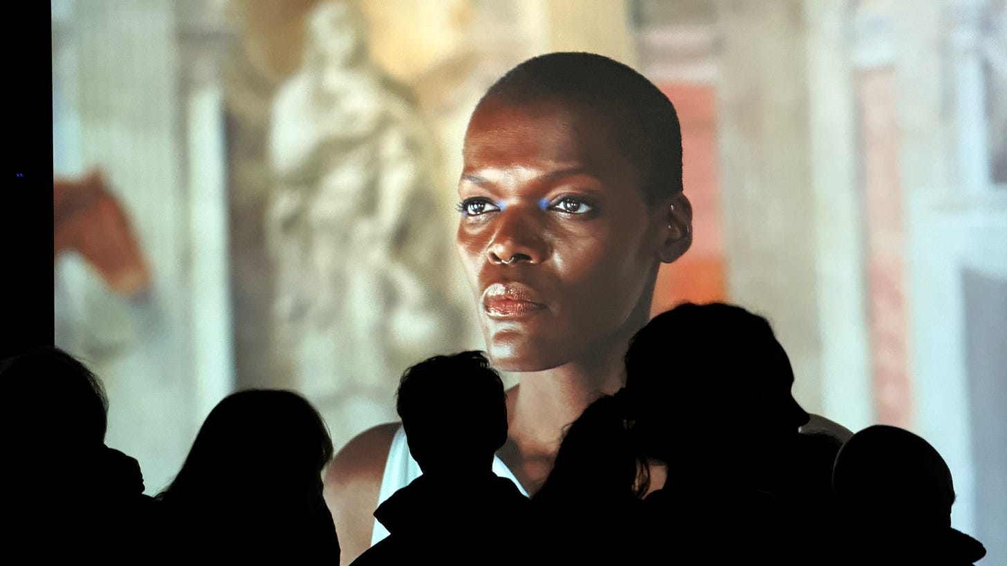 The choice of Palazzo Te is conceptually resonant. Originally conceived as a site of architectural experimentation, perspectival play and deliberate distortion, it challenged the symbolic and visual norms of Renaissance classicism. Julien draws out these qualities: circular mirrors fragment and multiply Christie’s statuesque figure, draped in diaphanous gowns that evoke both courtly splendour and futuristic apparition. The visual language echoes the shock of early perspectival innovation in sixteenth-century Italy - that sense of entering a new perceptual order.