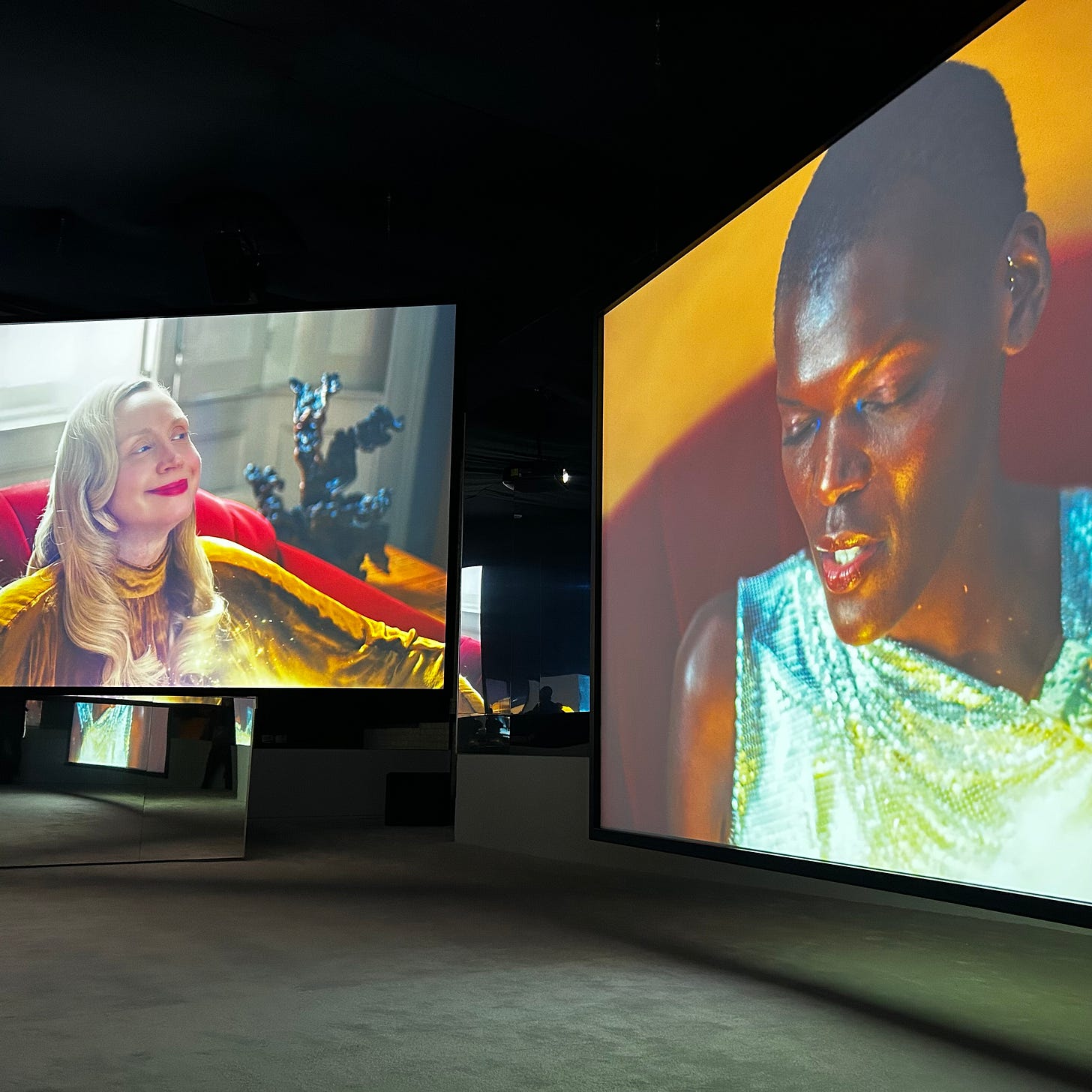 Julien has long explored the complexity of identity through the lenses of race, gender and sexuality. On the ground floor, a series of spectacular waxed inkjet prints offer a moment of stillness and surface beauty. Yet they do not fully prepare you for the immersive force of the multi-screen installation upstairs, where moving image reasserts itself as the core of Julien’s practice.
