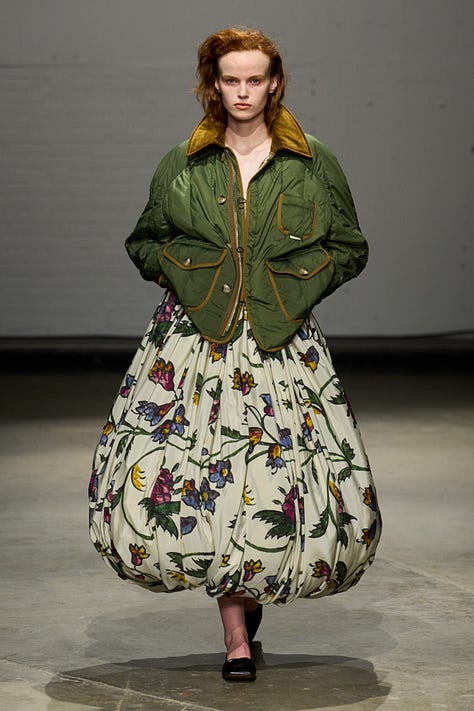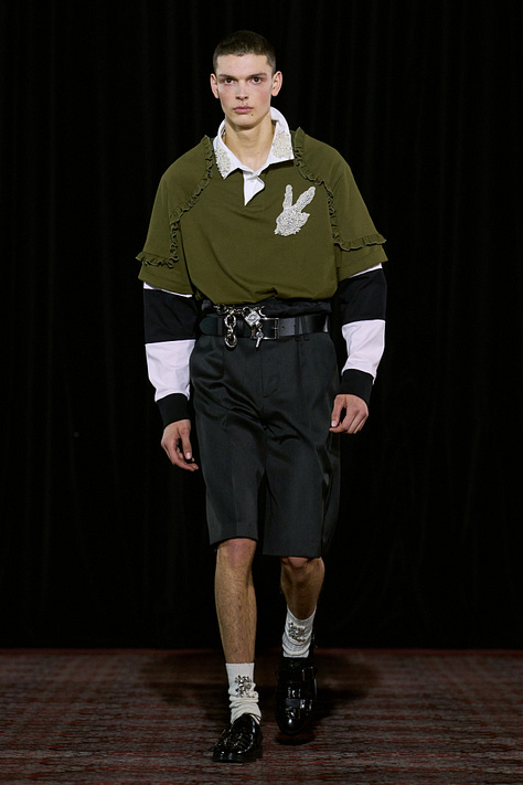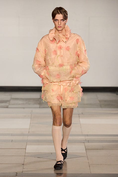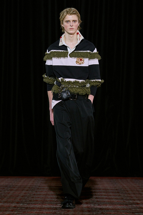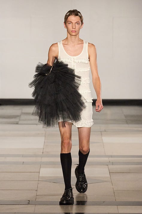 Elsewhere in the same video, Leigh makes a costume change of his own, reappearing in a frilled Little Bo Peep-style ensemble—bonnet and frilly pants included. This immediately brought to mind Simone Rocha’s AW25 collection, particularly her take on the rugby shirt, as well as her previous collection for the upcoming Spring/Summer season, which featured boys in ballet slippers, over-the-knee socks, and exaggeratedly wide shorts—inviting comparisons to the tutu. Of course, Leigh Bowery wasn’t the sole architect of gender play in fashion (that’s been happening forever), but it’s interesting to see echoes of his theatricality resurfacing in 2025.