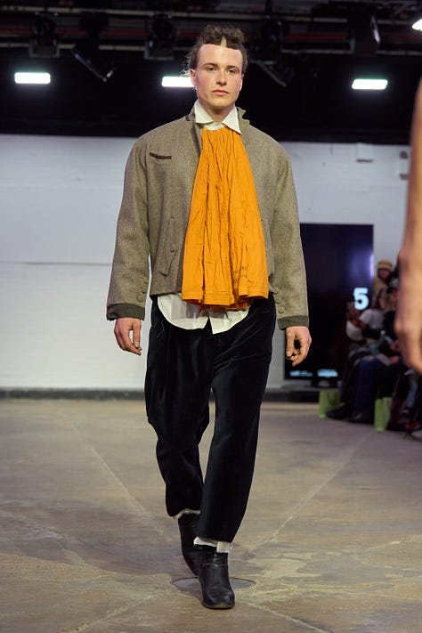 The CSM graduates seemed less interested in minimalism than in presence. Finnerty McKay’s tailoring, already widely talked about, balanced a deep affection for wool with seriously artful cutting, while pushing material experimentation into unexpected territory, recycled condoms past their sell-by date included. Around him, designers like Tito Crichton-Stuart, Pranjali Menaria and Clay Hattam all suggested a broader mood: historical dress details reworked not as costume, but as attitude.